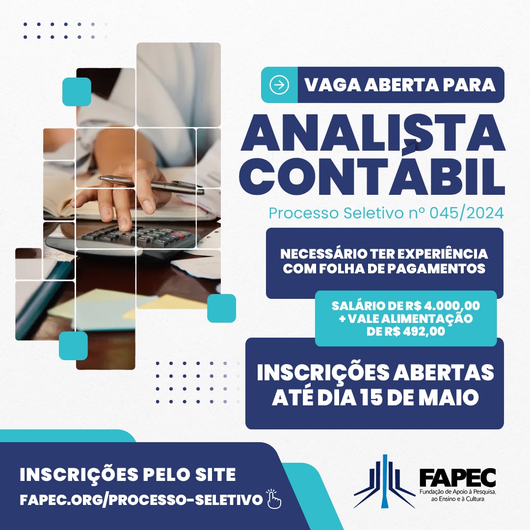 quinta-feira, 9 de maioA Fundação de Apoio à Pesquisa, ao Ensino e à Cultura (Fapec) está com processo seletivo para contratação de profissional da área de contabilidade para atuar como Analista Contábil. As inscrições para o processo seletivo 045/2024 estão abertas até o dia 15 de maio pelo site fapec.org/processo-seletivo. A vaga é para contratação na modalidade CLT, […]