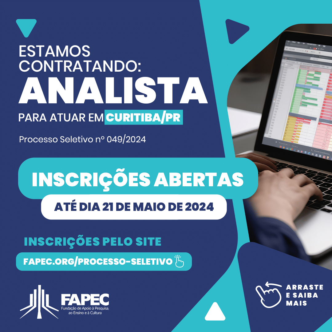 segunda-feira, 20 de maioA Fundação de Apoio à Pesquisa, ao Ensino e à Cultura (Fapec) está em busca de um profissional para atuar como Analista no Processo Seletivo nº 049/2024 na cidade de Curitiba, no Paraná. As inscrições podem ser realizadas pelo site fapec.org/processo-seletivo até o dia 21 de maio. O profissional interessado deve ter ensino superior completo, […]
