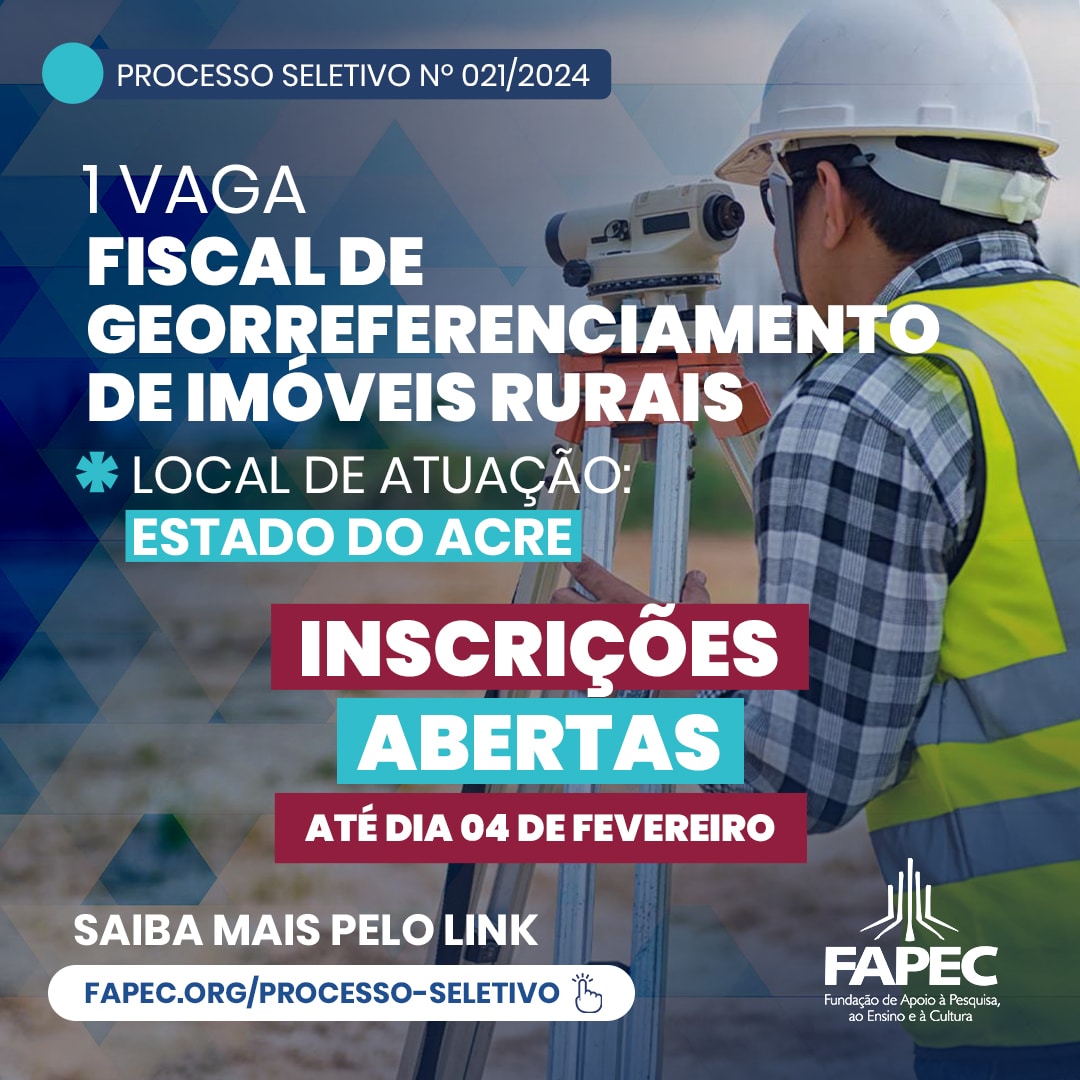 terça-feira, 23 de janeiroA Fundação de Apoio à Pesquisa, ao Ensino e à Cultura (Fapec) está com processo seletivo aberto para engenheiros cartógrafos ou de agrimensura até às 12 horas do dia 26 de janeiro. Os profissionais selecionados irão atuar como fiscais e gestores de georreferenciamento de imóveis rurais em um dos projetos com o Instituto Nacional de […]