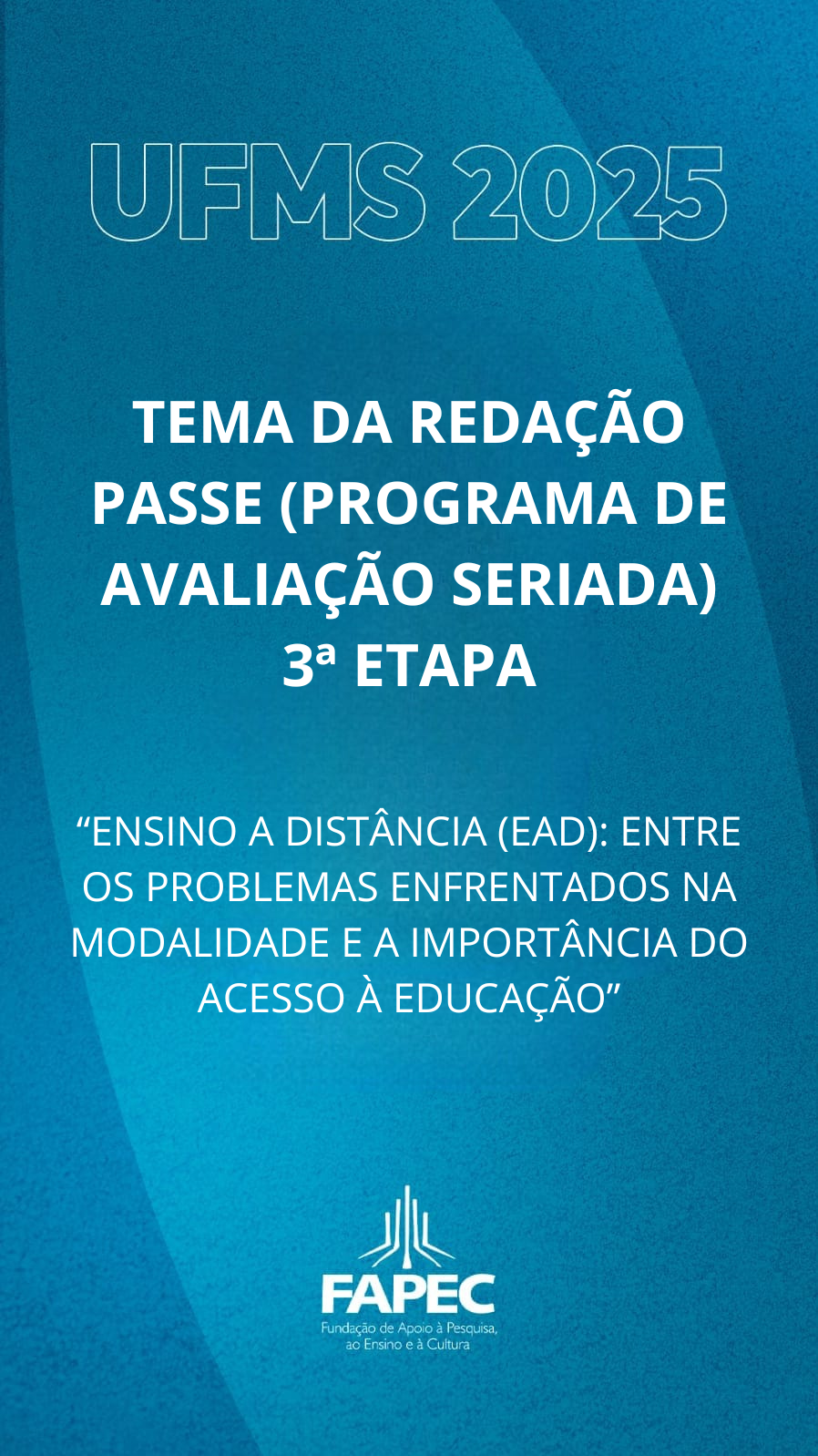 Ler maisA Fundação de Apoio à Pesquisa, ao Ensino e à Cultura (Fapec) informa que o tema da redação da terceira etapa do Programa de Avaliação Seriada (PASSE) da Universidade Federal de Mato Grosso do Sul (UFMS) é: “Ensino a Distância (EAD): entre os problemas enfrentados na modalidade e a importância do acesso à educação”. A […]