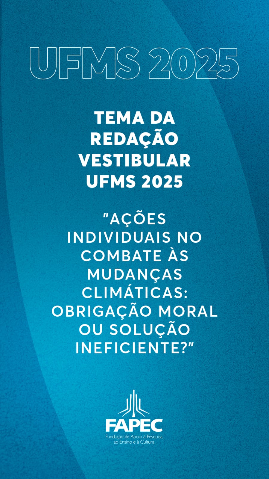 Ler maisA Fundação de Apoio à Pesquisa, ao Ensino e à Cultura (Fapec) informa que o tema da redação do Vestibular UFMS (Universidade Federal de Mato Grosso do Sul) 2025 é: “Ações Individuais no combate às mudanças climáticas: obrigação moral ou solução ineficiente?” . O Vestibular está sendo realizado por cerca de 20 mil candidatos que […]