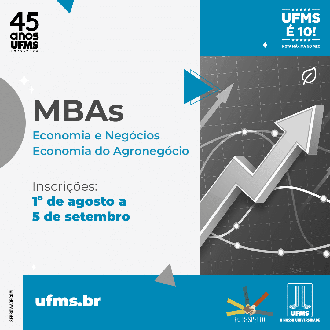 Ler mais*Com informações da AGECOM/UFMS Estão abertas as inscrições para os processos seletivos para ingresso nos programas de MBA em Economia do Agronegócio e MBA em Economia e Negócios. Ambos são oferecidos pela Escola de Administração e Negócios (Esan) da UFMS. Os interessados devem se inscrever até 5 de setembro. “Apoiamos totalmente a realização de MBAs […]