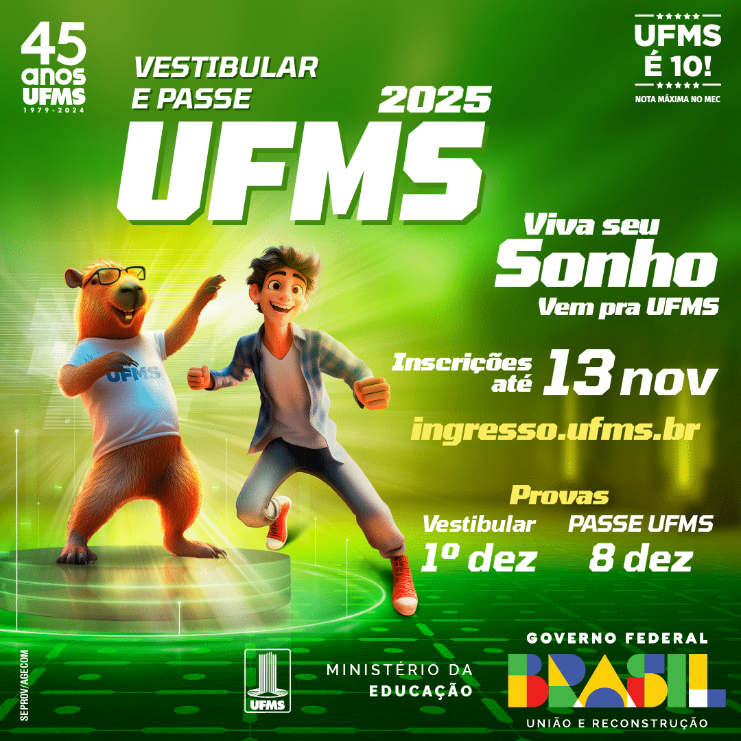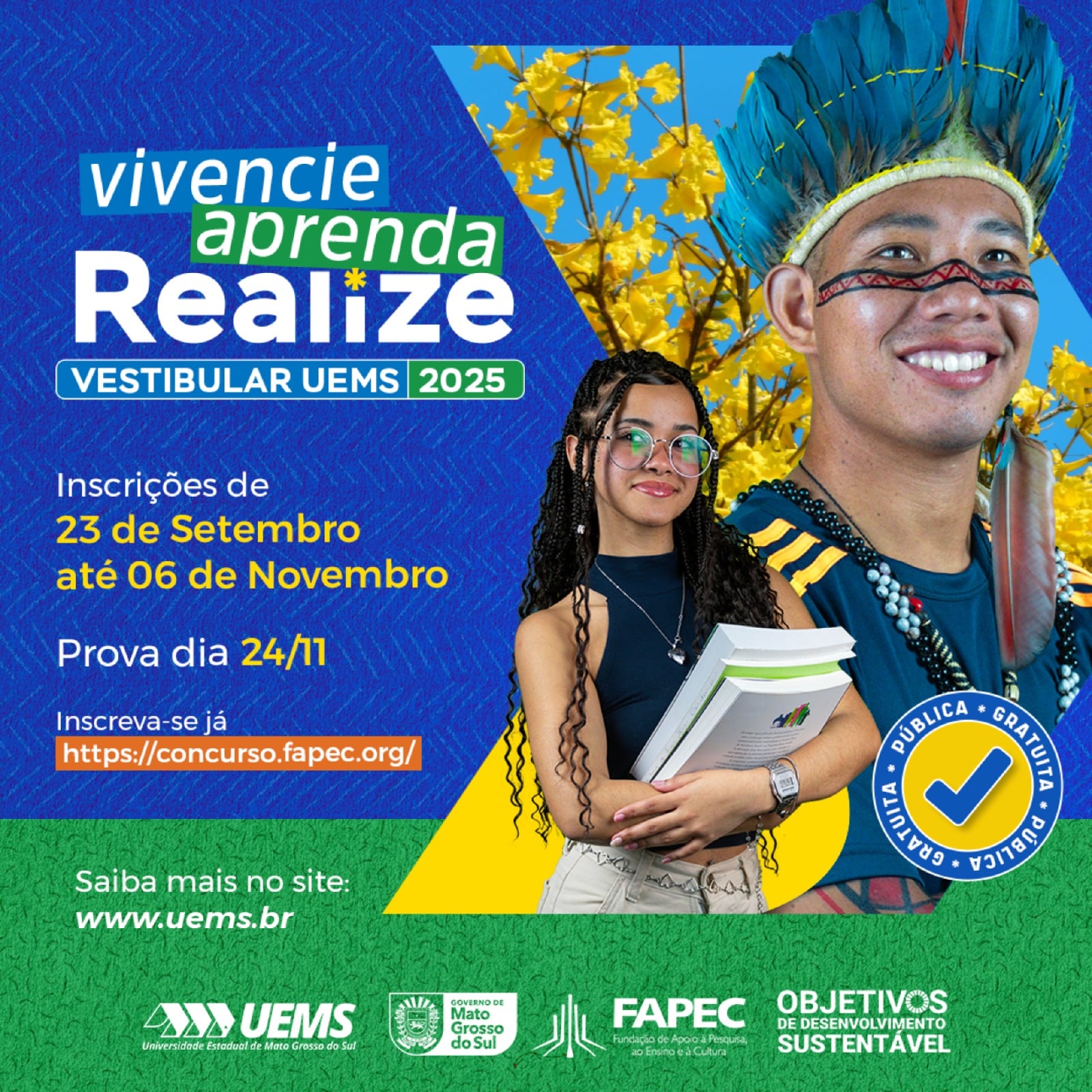 Ler maisA Universidade Estadual de Mato Grosso do Sul (UEMS) abriu hoje (23/09) as inscrições para o Vestibular UEMS 2025, que oferece 641 vagas distribuídas em 30 cursos de graduação. As inscrições podem ser feitas exclusivamente pela internet, por meio do site da FAPEC (concurso.fapec.org) até as 23h59 do dia 6 de novembro de 2024 (horário […]