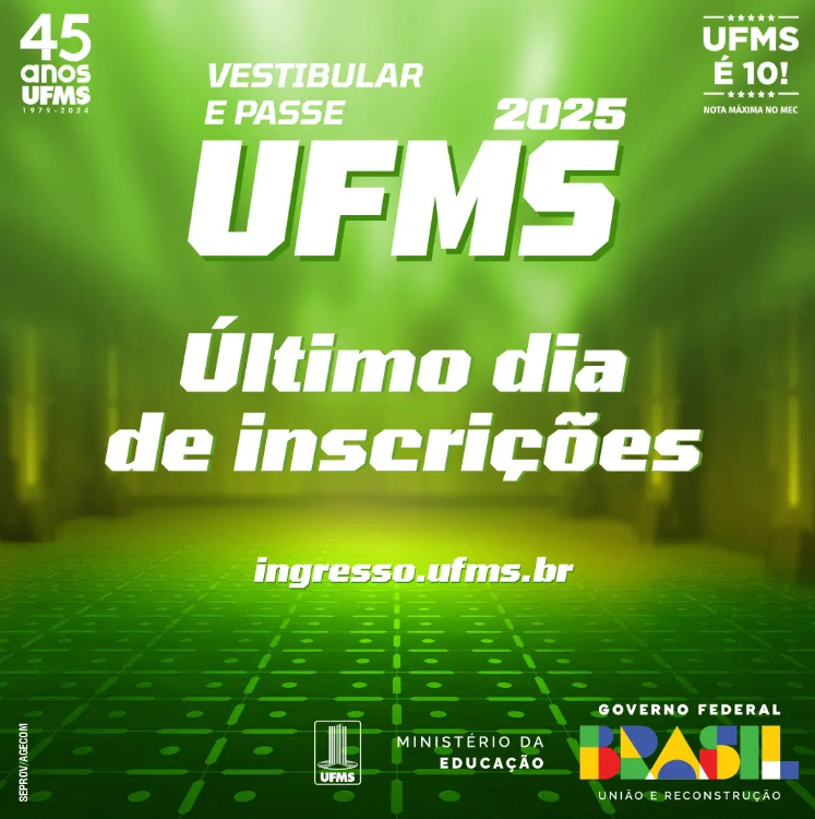Ler maisAs inscrições para o Vestibular da Universidade Estadual de Mato Grosso do Sul (UEMS) 2025 estão abertas até as 23h59 (horário oficial do Mato Grosso do Sul) desta quarta-feira (06). O processo seletivo oferta 641 vagas, distribuídas em 30 cursos de graduação. As inscrições podem ser feitas exclusivamente pela internet, por meio do site da […]