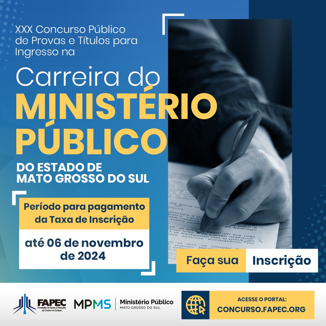Ler maisO prazo para inscrições no XXX Concurso Público de Provas e Títulos para o cargo de Promotor de Justiça Substituto do Ministério Público do Estado de Mato Grosso do Sul (MPMS) encerra amanhã, 5 de novembro de 2024. As inscrições devem ser feitas exclusivamente pelo site concurso.fapec.org, com uma taxa de R$ 280,00, cujo pagamento […]