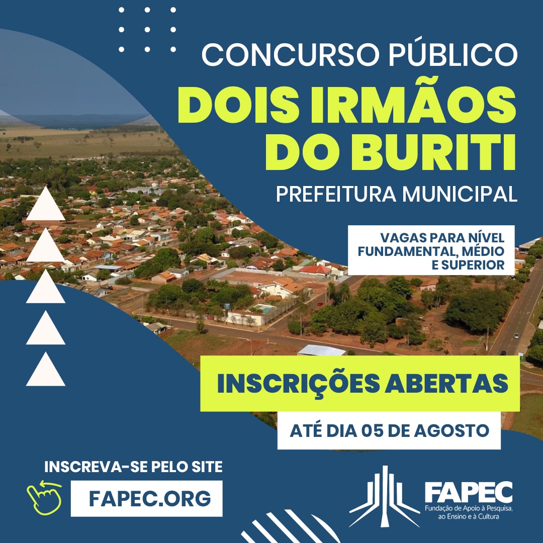 Ler maisEstão abertas as inscrições para o concurso público da Prefeitura de Dois Irmãos do Buriti, com vagas para os níveis fundamental, médio e superior. Os candidatos interessados podem se inscrever pelo site da banca responsável pelo certame, a Fundação de Apoio à Pesquisa, ao Ensino e à Cultura (Fapec), no link fapec.org, até o dia […]