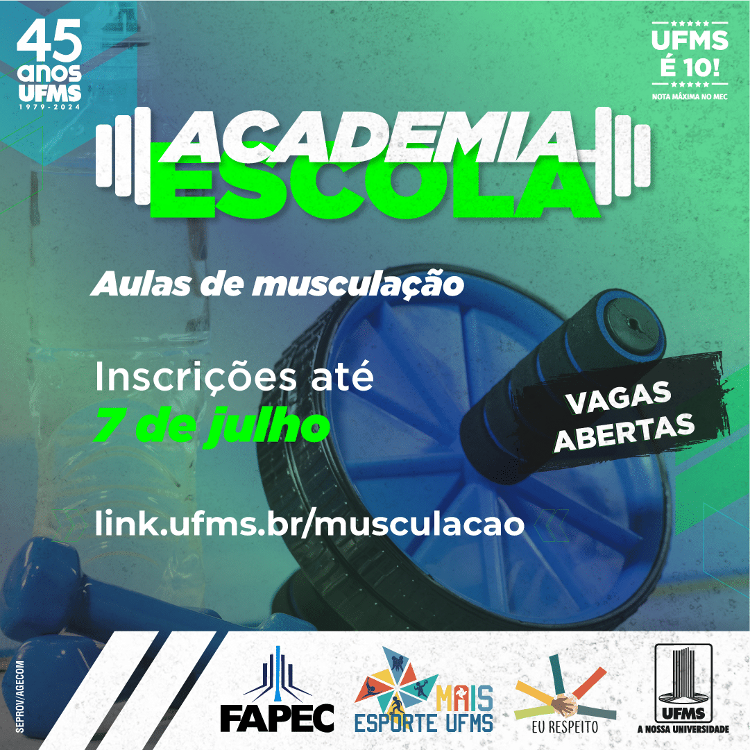 Ler mais*Com informações da Agecom/UFMS O Programa Academia Escola UFMS está com inscrições abertas até o dia 7 de julho para aulas de musculação e pilates solo na Cidade Universitária. Podem se inscrever estudantes de graduação e pós-graduação, servidores, participantes da Universidade Aberta à Pessoa Idosa (Unapi), colaboradores da Fundação de Apoio à Pesquisa, ao Ensino […]