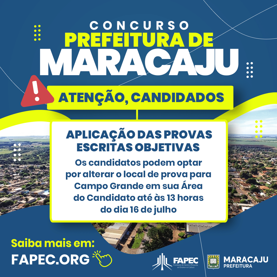 Ler maisCandidatos inscritos no concurso público para a Prefeitura de Maracaju podem optar por alterar o local de realização das provas escritas objetivas até às 13 horas do dia 16 de julho por meio da “Área do Candidato”, disponível no link. Além do município de Maracaju, as provas vão ser realizadas também em Campo Grande. Para […]